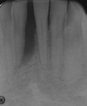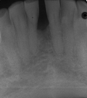 En la radiografía 1 (antes del tratamiento regenerativo) se ve una gran pérdida de hueso alrededor del incisivo inferior (espacio oscuro alrededor de la raíz), provocando prácticamente la caída del diente. El paciente acude a nuestra consulta a solicitar una segunda opinión, ya que la valoración anterior, dado el mal pronóstico del diente, propuso la extracción del mismo.